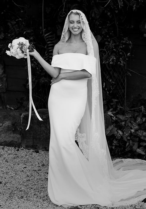 A bride wearing an off the shoulder wedding dress and lace veil.