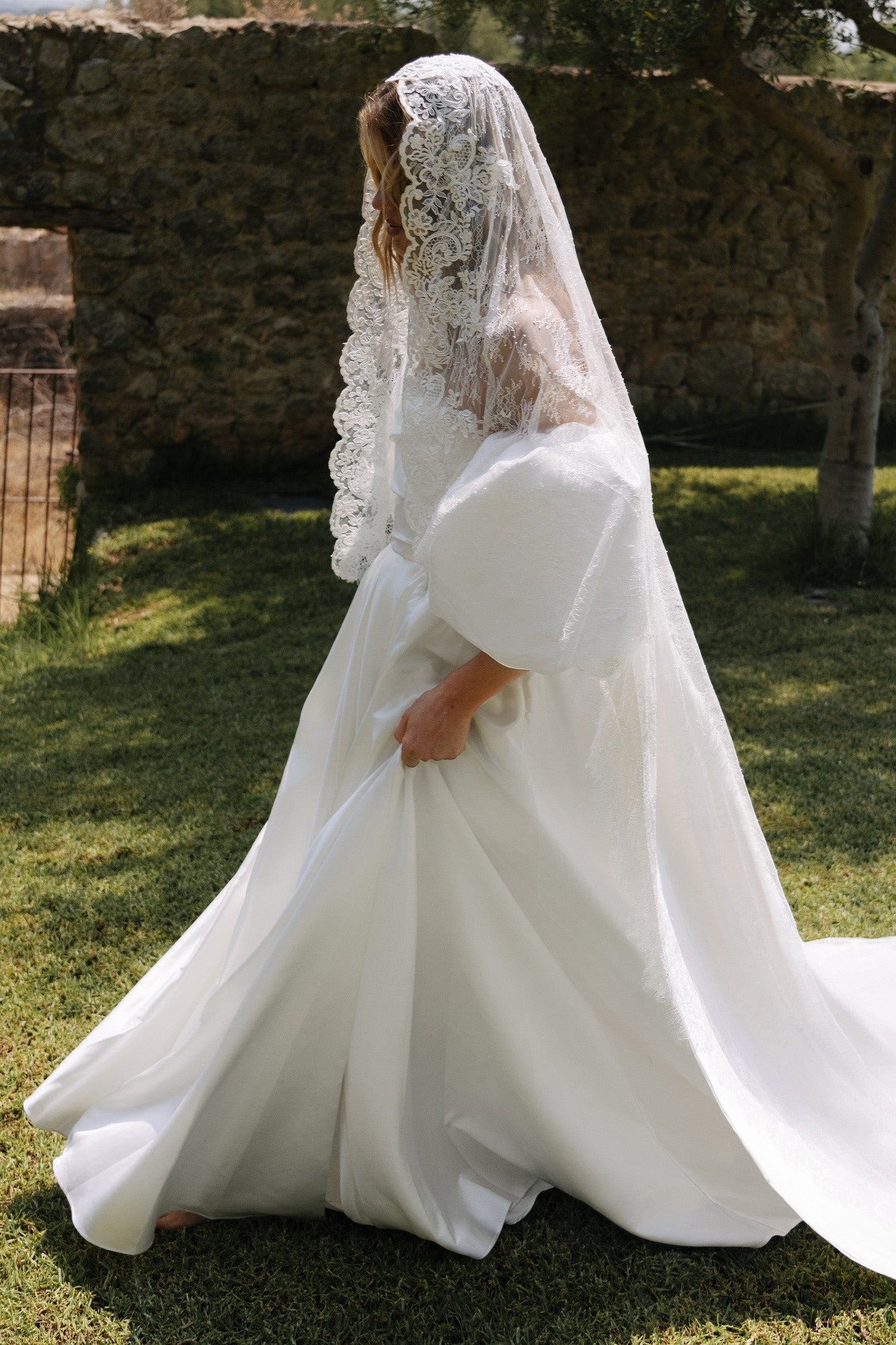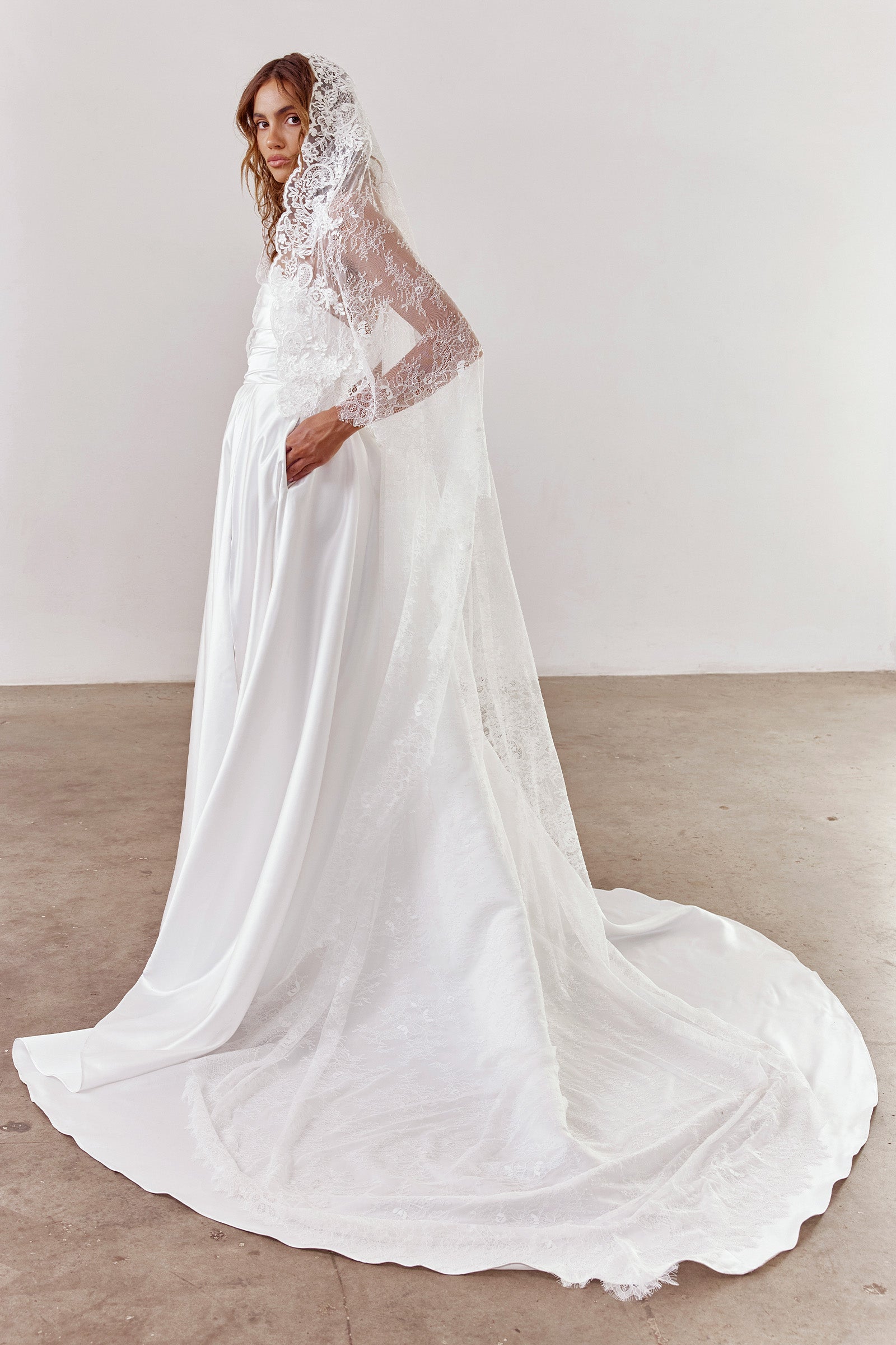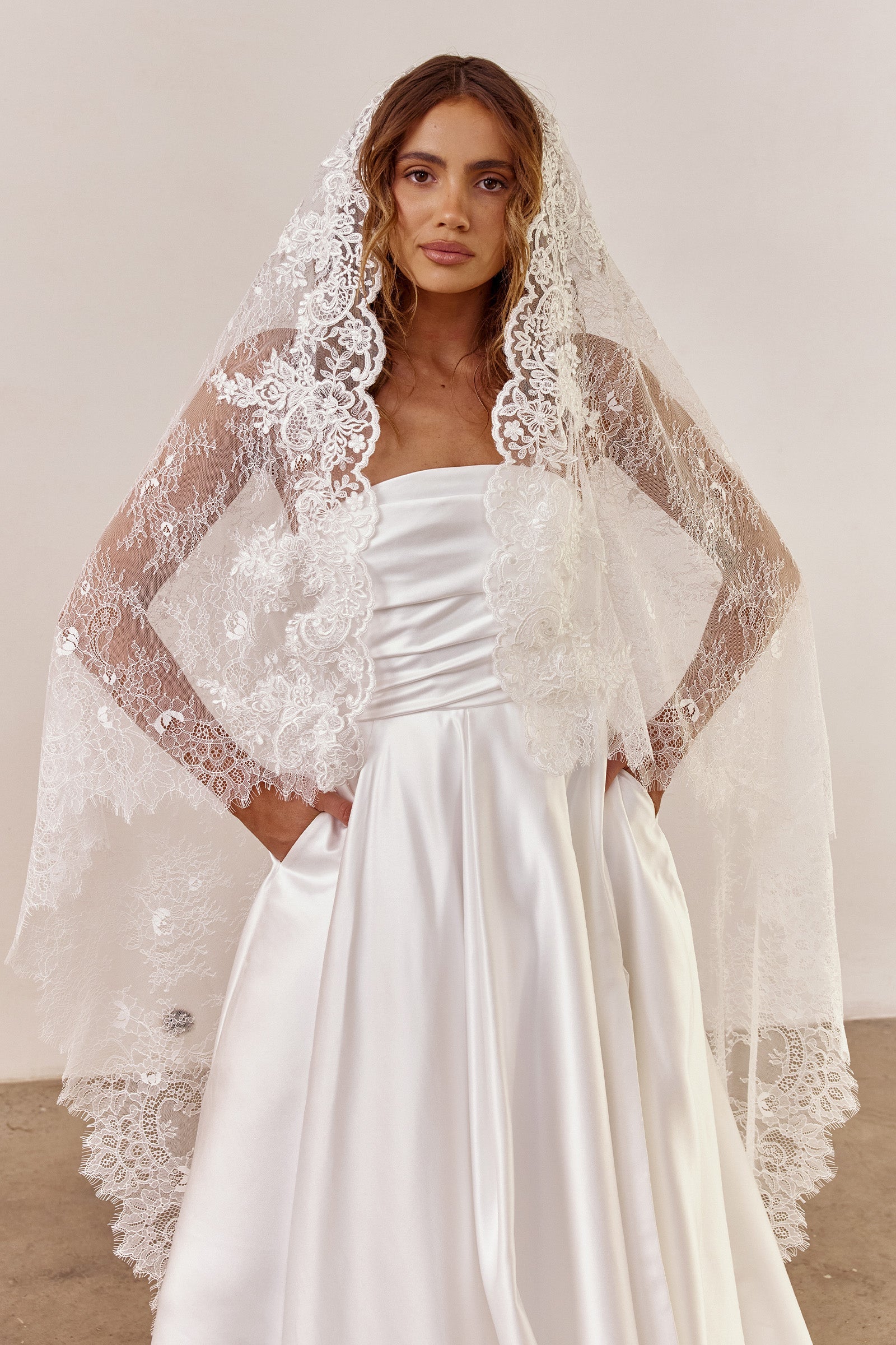 A touch of heritage framed in lace. Our Alchemy veil is crafted from delicate Chantilly lace with a scalloped corded embroidery trim that softly frames the face. Deeply romantic and inspired by tradition, this Mantilla veil is the ultimate ceremony piece.