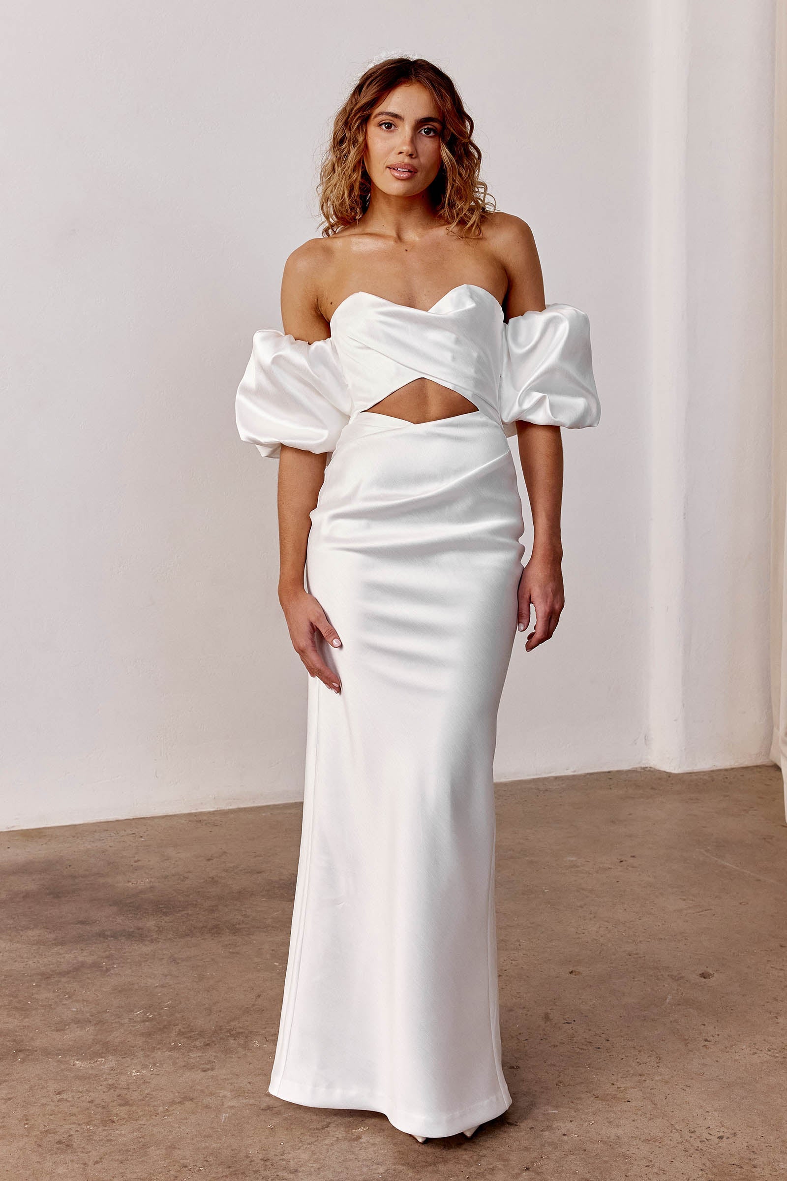 All eyes on Emory, a modern take on the puff-sleeve. Made for rehearsal dinners, wedding receptions and every event in between, she's a casual wedding dress that still makes a statement.