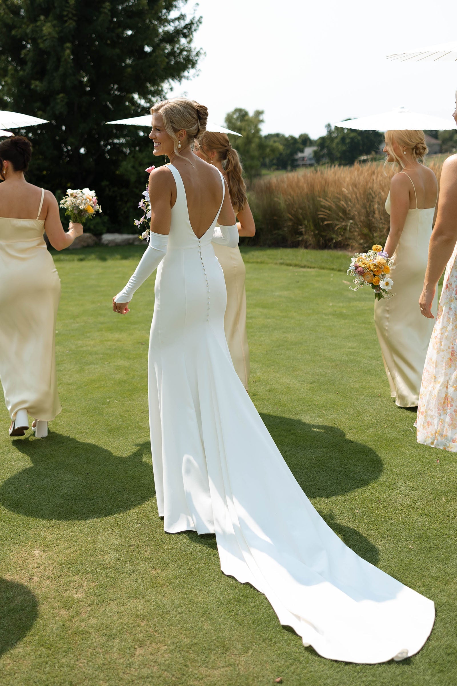 Un escote bajo estructurado y una espalda muy pronunciada ofrecen un look nupcial elegante y moderno con la cantidad justa de dramatismo.