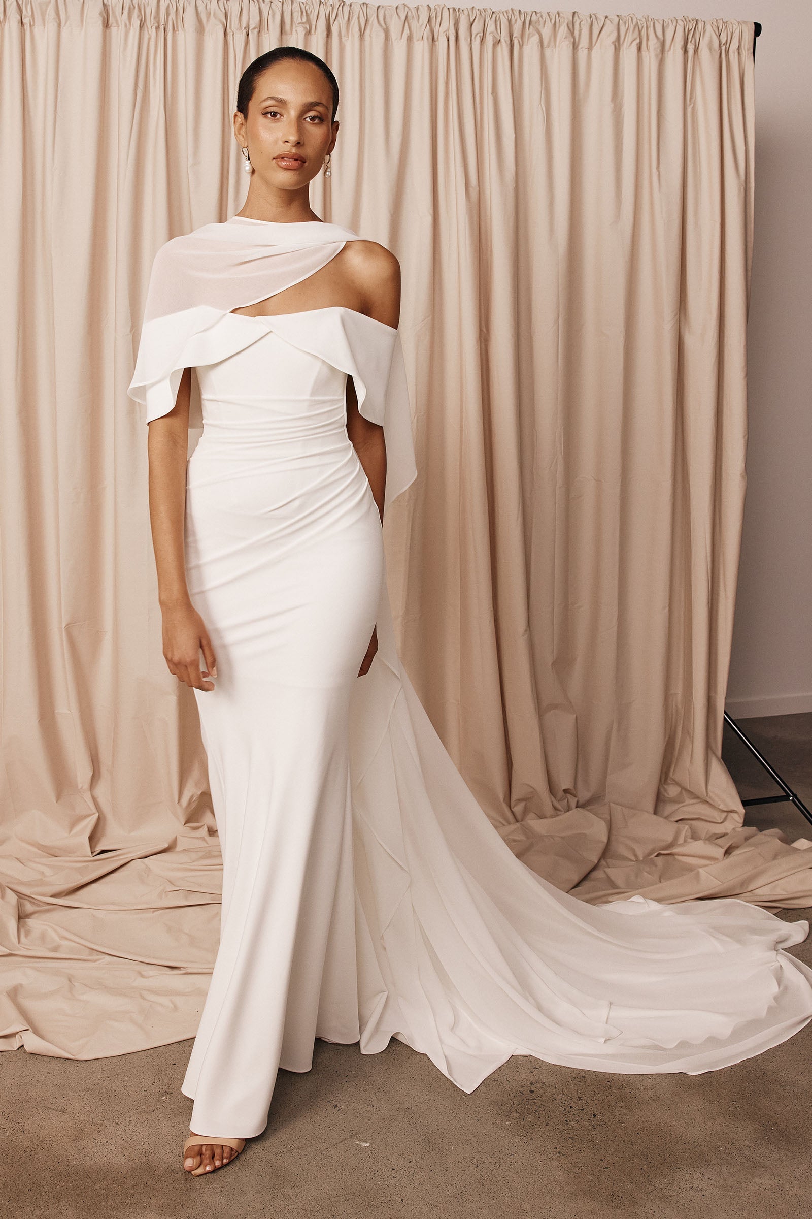 A sheer layer for elevated styling. The Whisper Cape is made from poly georgette with a soft, silk-like finish. Light and fluid, this barely-there wedding shawl adds a soft, European-inspired layer to any Grace gown.