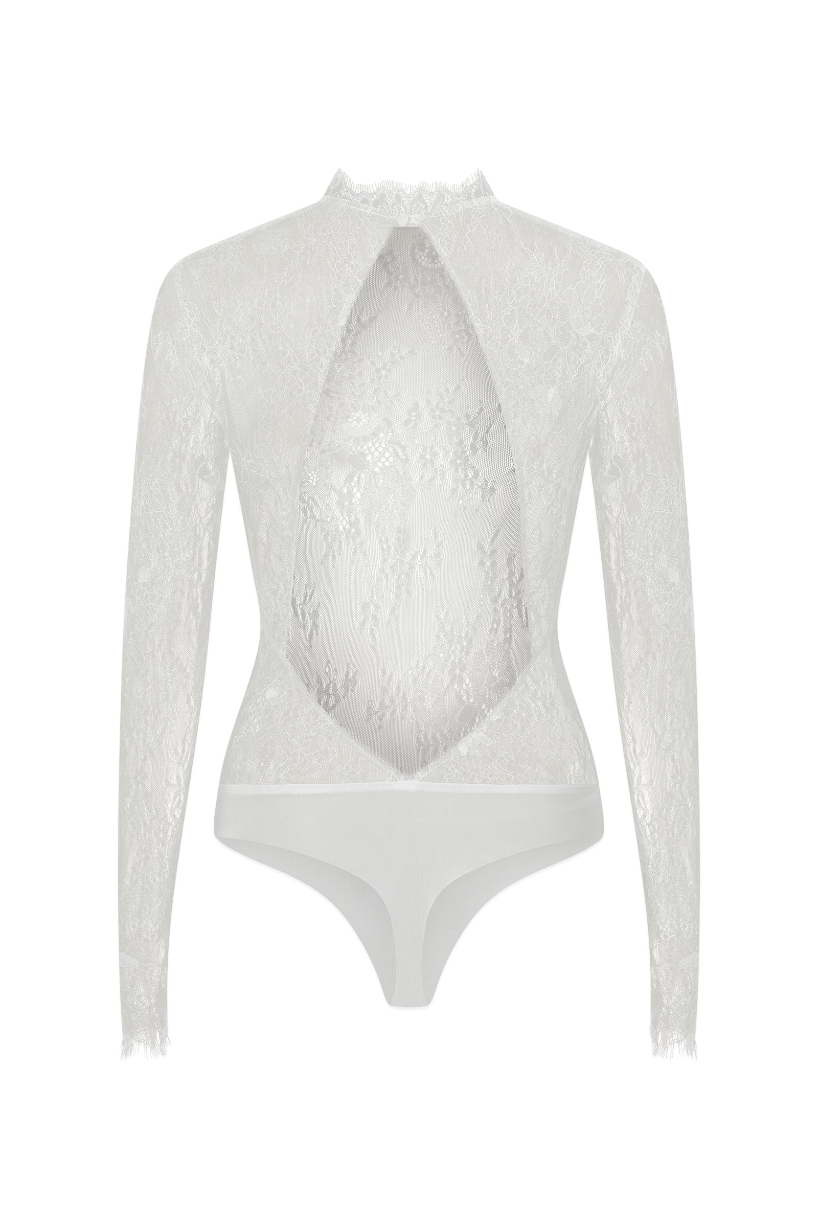 Crafted from soft Chantilly lace and finished with a seamless stretch powermesh brief, she features a high neckline, slim-fit sleeves, and a flattering open back, designed to pair effortlessly with a selection of Grace gowns.