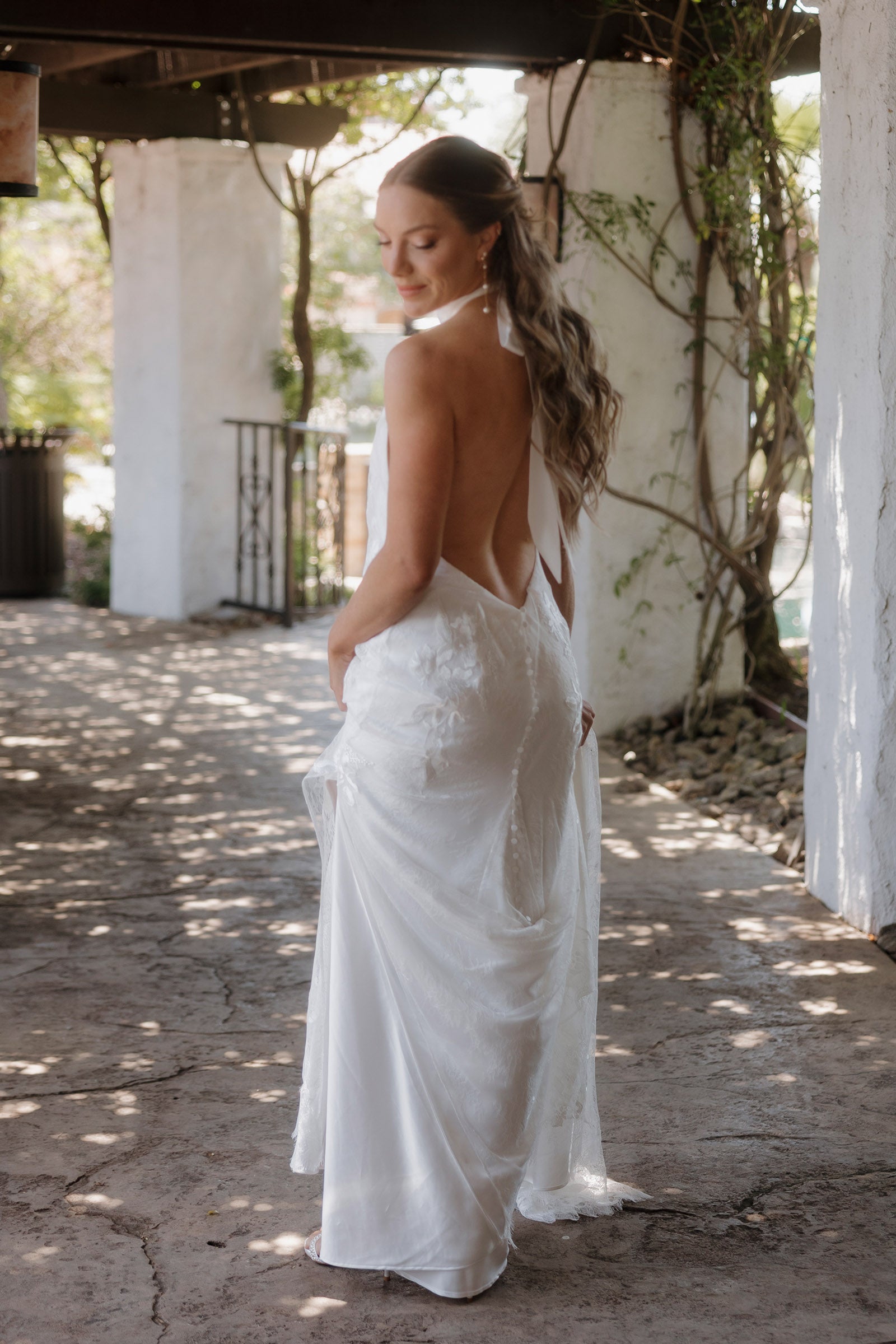 Stevie is as authentic as the love she celebrates. This poetic creation marries Chantilly lace with intricate hand-appliqued embroidery, culminating in a confident high neckline that celebrates character and creativity.